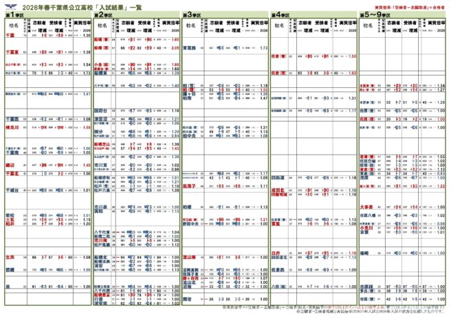ここでは高校別の集計データをもとに「学区別」「偏差値順」に高校を並べて前年の「志願変更初日」と比較した一覧表を作成。「志願変更」を検討する際の参考にしてください。志願変更期間は2/13(木)16時までです。最終的な志願者の確定数も千葉県教育委員会より発表される予定です。