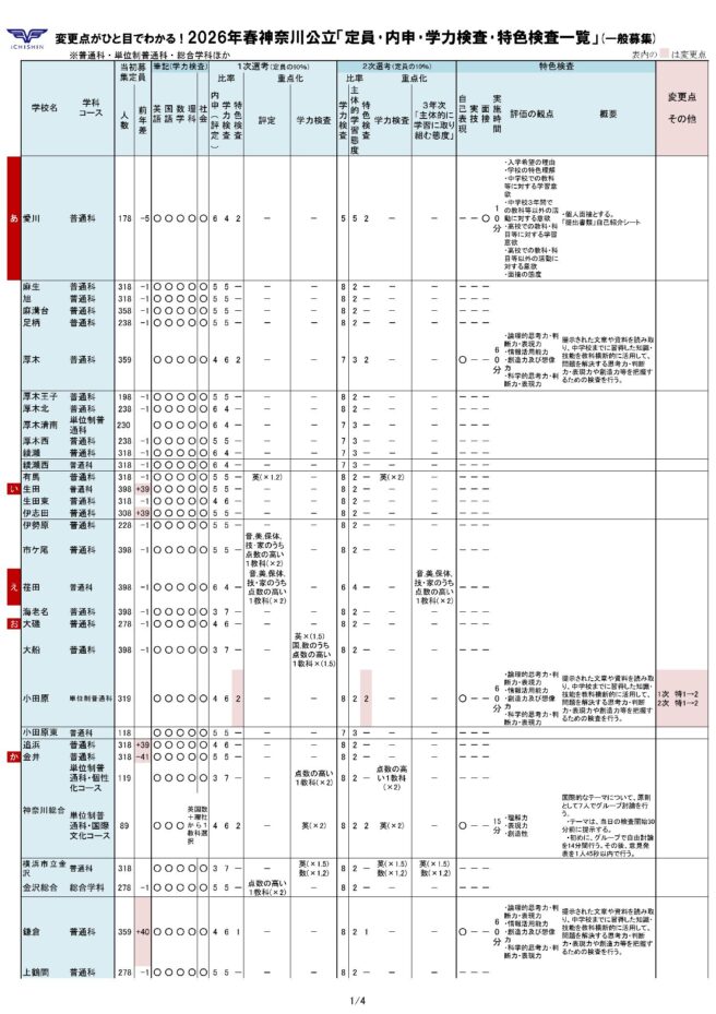 ➡変更点がひと目でわかる!2026年春神奈川公立「定員・内申・筆記・特色検査」一覧(PDF)